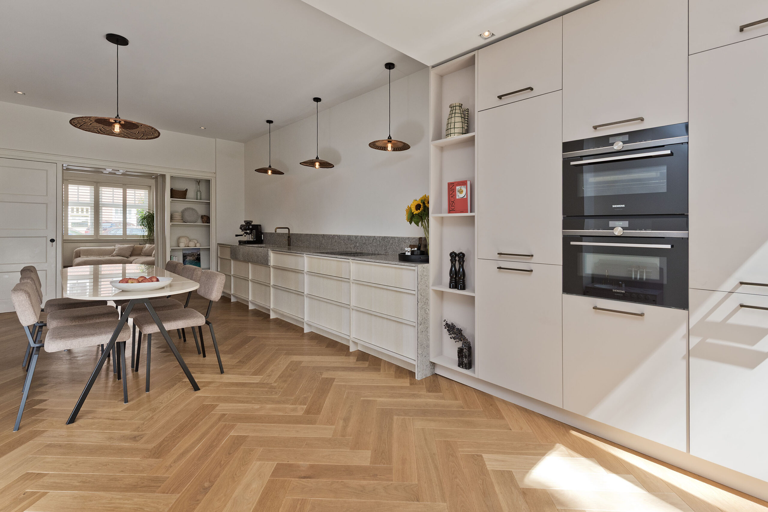 Prachtige hoogwaardig afgewerkte keuken met een composiet aanrechtblad en spoelbkak met Quooker. De keuken is uitgevoerd met kwaliteitsapparatuur van Siemens en veel kastruimte, grote laden en voorzien van een: 4-pits inductiekookplaat met kookveldafzuigsysteem, combi-oven, stoomoven, vaatwasser, koelkast, en een aparte vriezer.