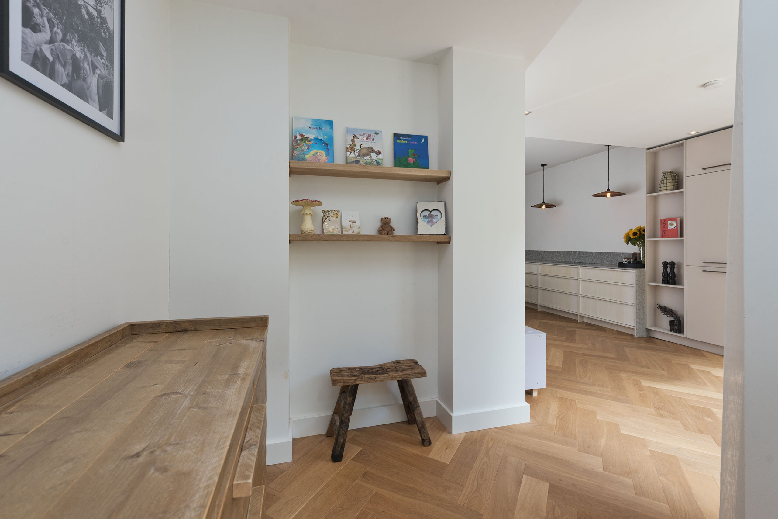 Eigen entree, gang met garderobenis, separate wc met fontein, ruime hal met toegang tot alle vertrekken, luxe badkamer, slaapkamer aan de voorzijde, kamer ensuite met woonkamer aan de voorzijde, grote eetkeuken aan de achterzijde met openslaande deuren naar de tuin, slaapkamer aan de achterzijde eveneens met toegang tot de tuin en de hoofdslaapkamer met inbouwkast en toegang tot de tuin aan de achterzijde. Er zijn thans twee slaapkamers maar de voormalige keukenruimte kan eenvoudig worden afgesloten waardoor er een derde slaapkamer / werkkamer gecreëerd kan worden.