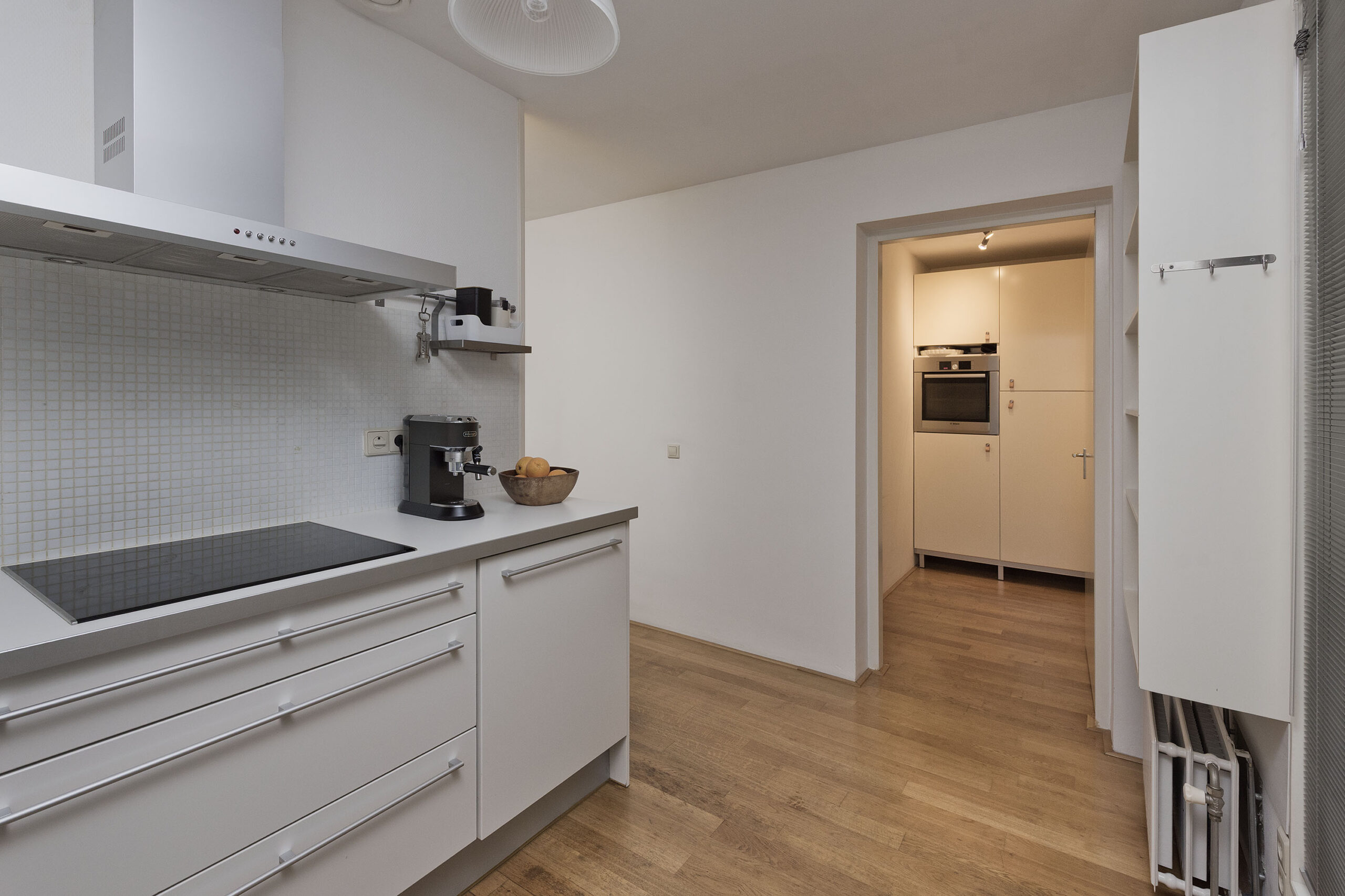 Witte keuken met een wit aanrechtblad en een betegelde achterwand, voorzien van een spoelbak met ééngreepsmengkraan, 4-pits inductiekookplaat, afzuiger, koelkast met vriezer en een vaatwasser. Bijkeuken voorzien van bergkasten en een oven.